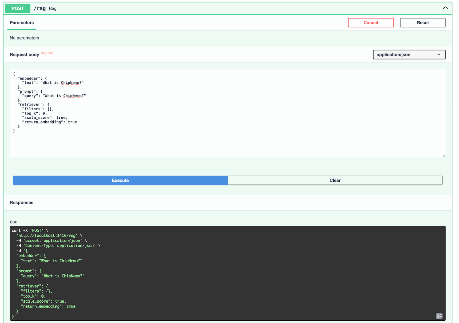 To deploy the RAG pipeline, execute hayhooks deploy rag.yaml which will expose the pipeline on http://localhost:1416/rag by default. You can then visit http://localhost:1416/docs for the API docs and try out the pipeline.