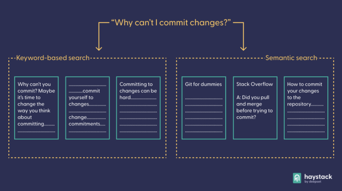 The superiority of semantic search over a keyword-based approach becomes clear if we look at an example. Think of the difference between the queries “why can’t I commit changes” — a perennial problem for the novice Git user — and “why can’t I commit to changes” — a problem for the indecisive. The preposition “to” entirely changes the meaning of the query, which is impossible to detect with simple keyword matching. A semantic language model (like the one used by Google) will embed the two queries in disparate locations of the vector space.