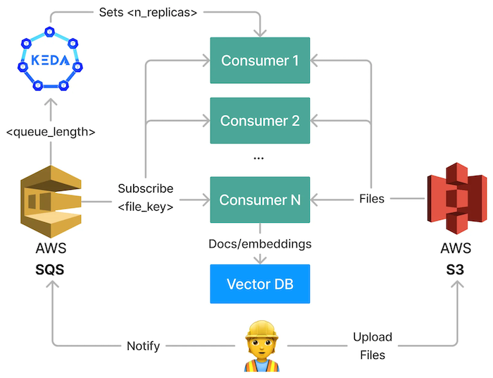We have a stateless service that processes indexing requests asynchronously and can operate in Docker Compose. We can now deploy this service to Kubernetes, configure KEDA, and scale it.