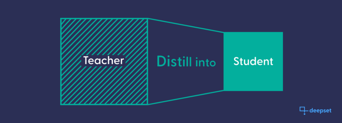 A large, pre-trained model serves as a teacher for an untrained smaller model, which is trained to mimic the teacher. The result is a compressed, less resource intensive model with similar results.